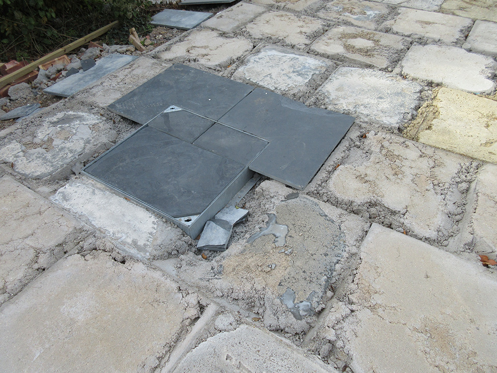 The manhole covers – there were four in total – had been set by the builder to correct levels, but were merely placed on the MOT Type 1, and not fixed with any mortar. Because the mortar biscuits and their slabs were mobile, the metal covers were not fixed to the ground, with voids under the slabs as may be seen in the photograph.